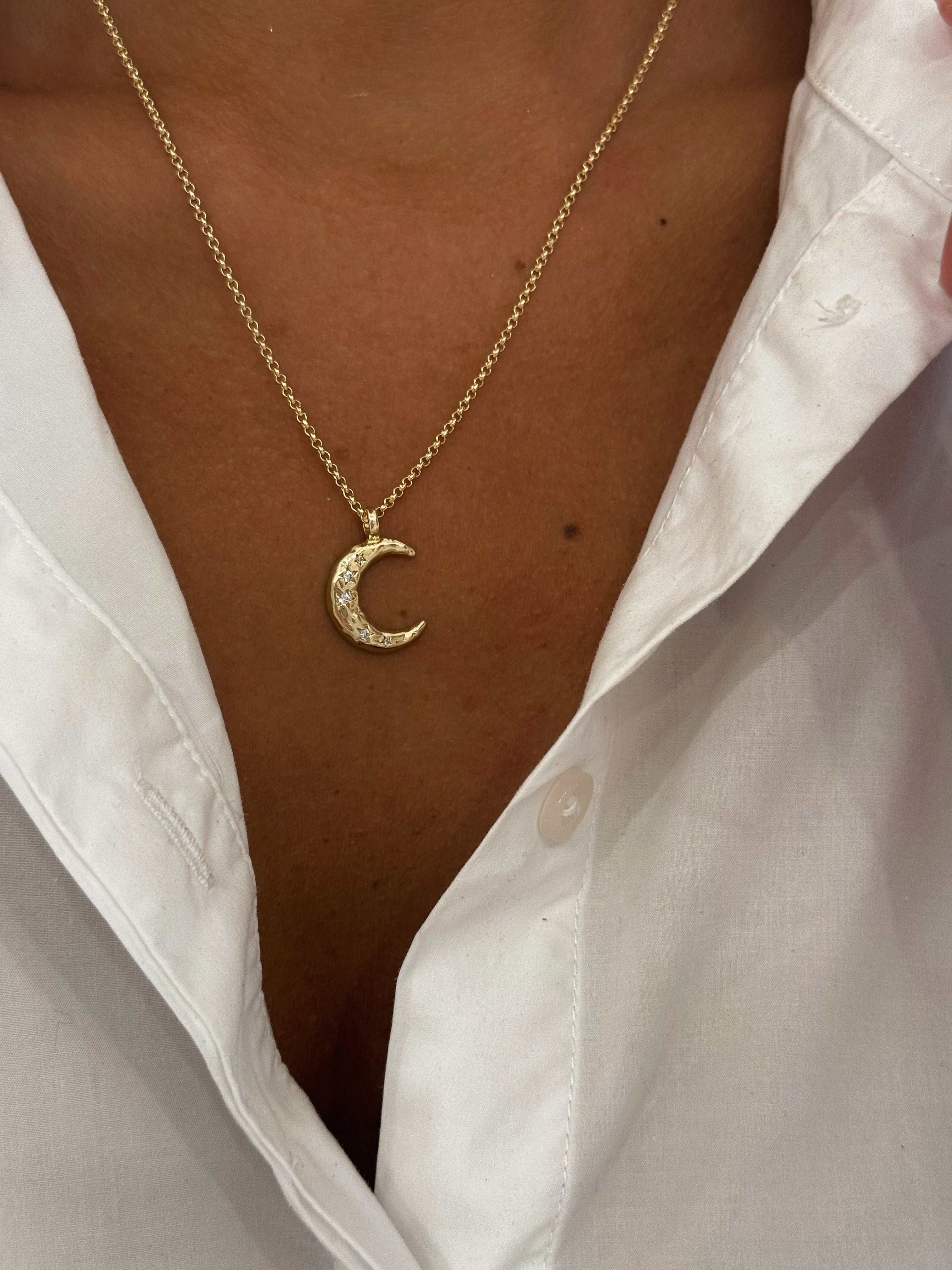 Collier plaqué or avec motif en forme de demi-lune avec quelques zircons.