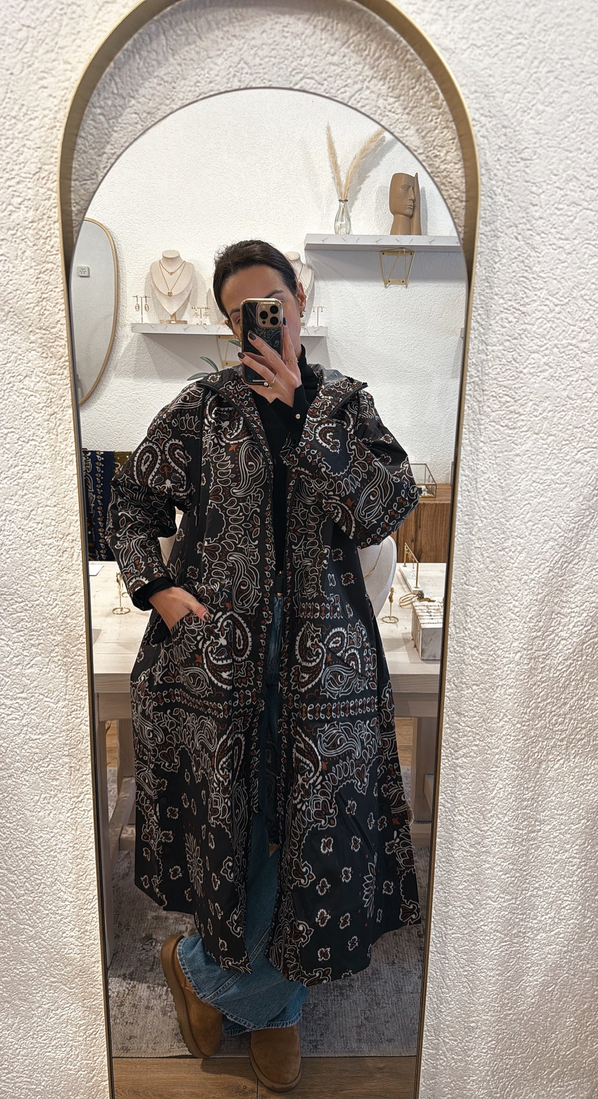 Décliné en deux couleurs, noire et bleu marine, il nous protège de la tête aux pieds grâce à sa longueur aux chevilles et à sa large capuche. Il se ferme par un zip et s’équipe de très grandes poches rabat ainsi que de deux fentes sur chaque côté pour une liberté de mouvement parfaite et fonctionnelle. Dans sa version bleu marine, les motifs cachemire sont écrus et chocolat.