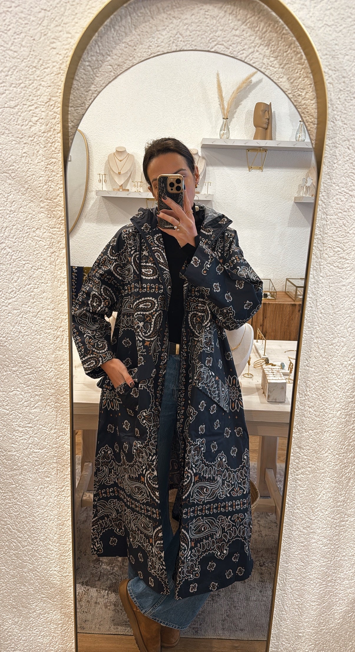 Décliné en deux couleurs, noire et bleu marine, il nous protège de la tête aux pieds grâce à sa longueur aux chevilles et à sa large capuche. Il se ferme par un zip et s’équipe de très grandes poches rabat ainsi que de deux fentes sur chaque côté pour une liberté de mouvement parfaite et fonctionnelle. Dans sa version bleu marine, les motifs cachemire sont écrus et caramel.